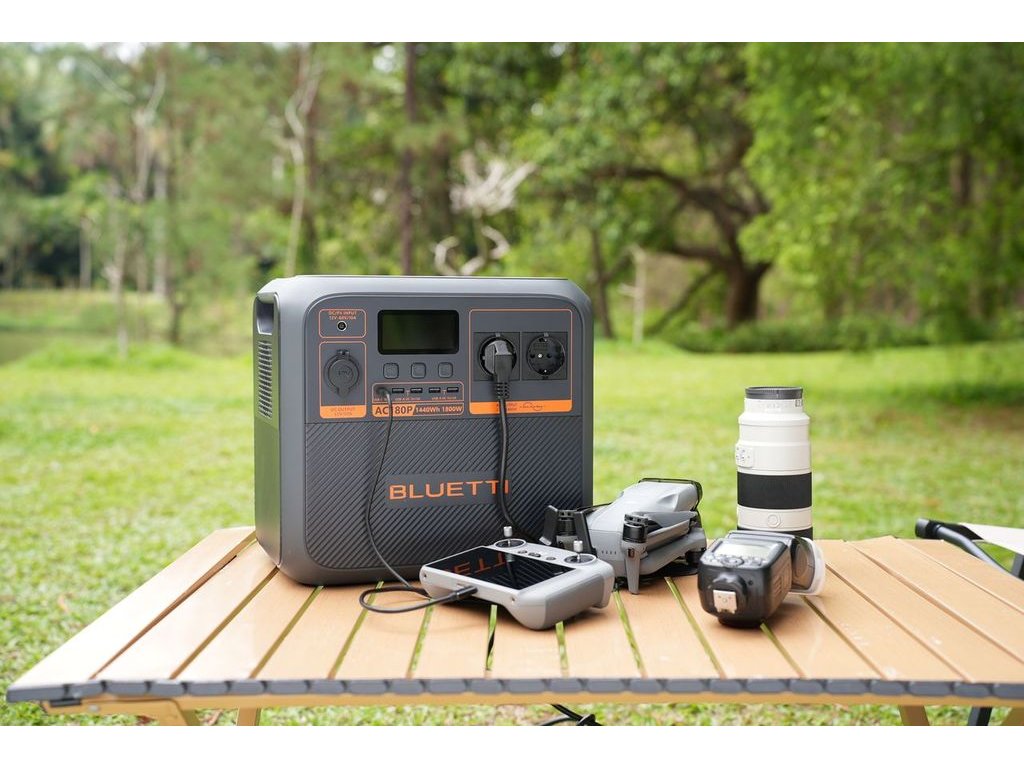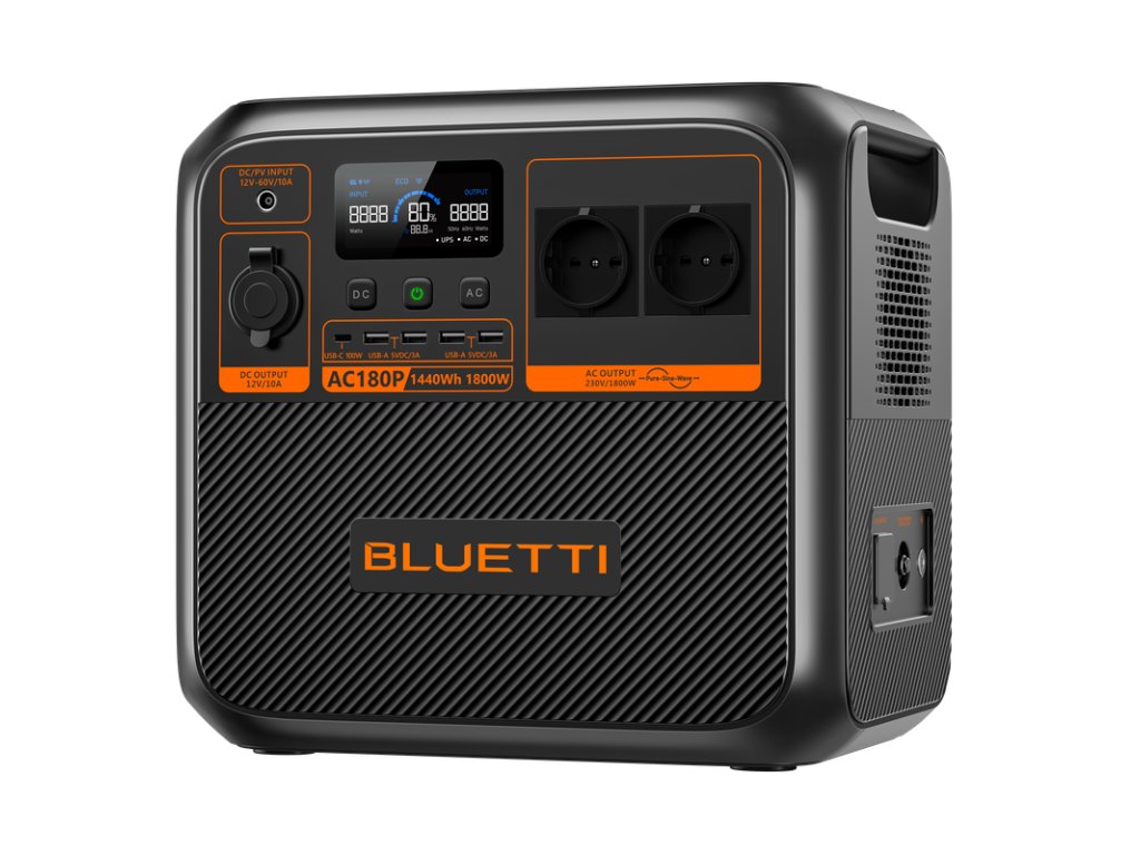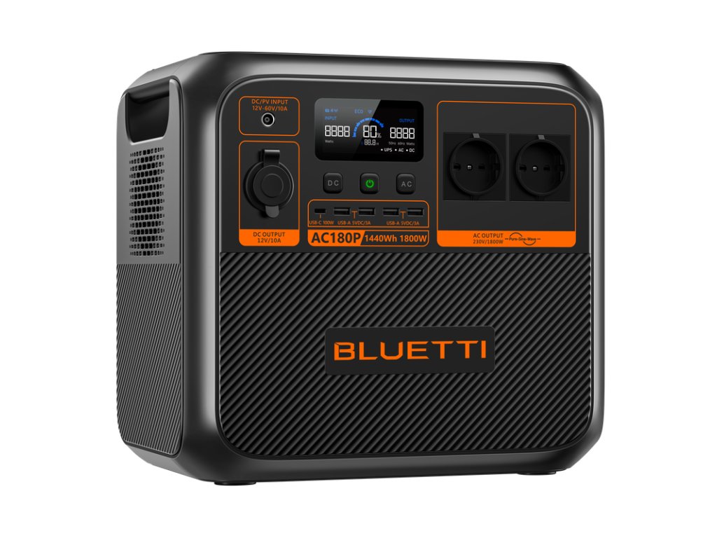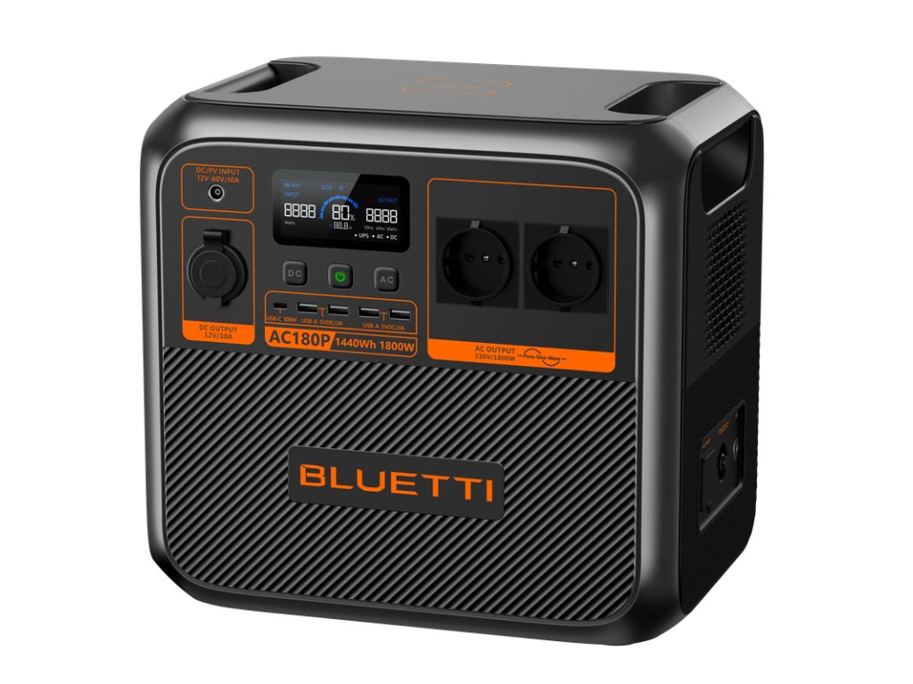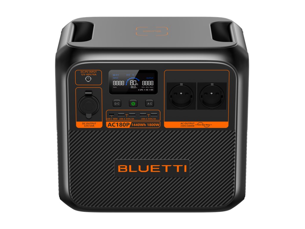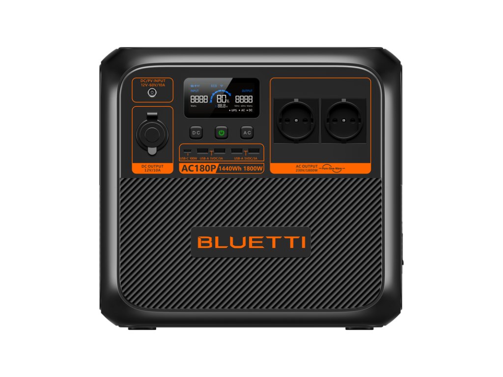 - BLUETTI AC180P je přenosná stanice s 1440 Wh LiFePO4 baterií, která poskytuje 1800 W čisté sinusové vlny pro napájení spotřebičů. Vhodná pro kempování, cestování, nebo jako záložní zdroj energie během výpadků proudu. Rychlé nabíjení z AC a solárních panelů a podpora až 500 W DC nabíjení zajišťují maximální flexibilitu. Přenosná stanice podporuje také aplikaci pro kontrolu spotřeby a vzdálené ovládání přes Wi-Fi a Bluetooth.